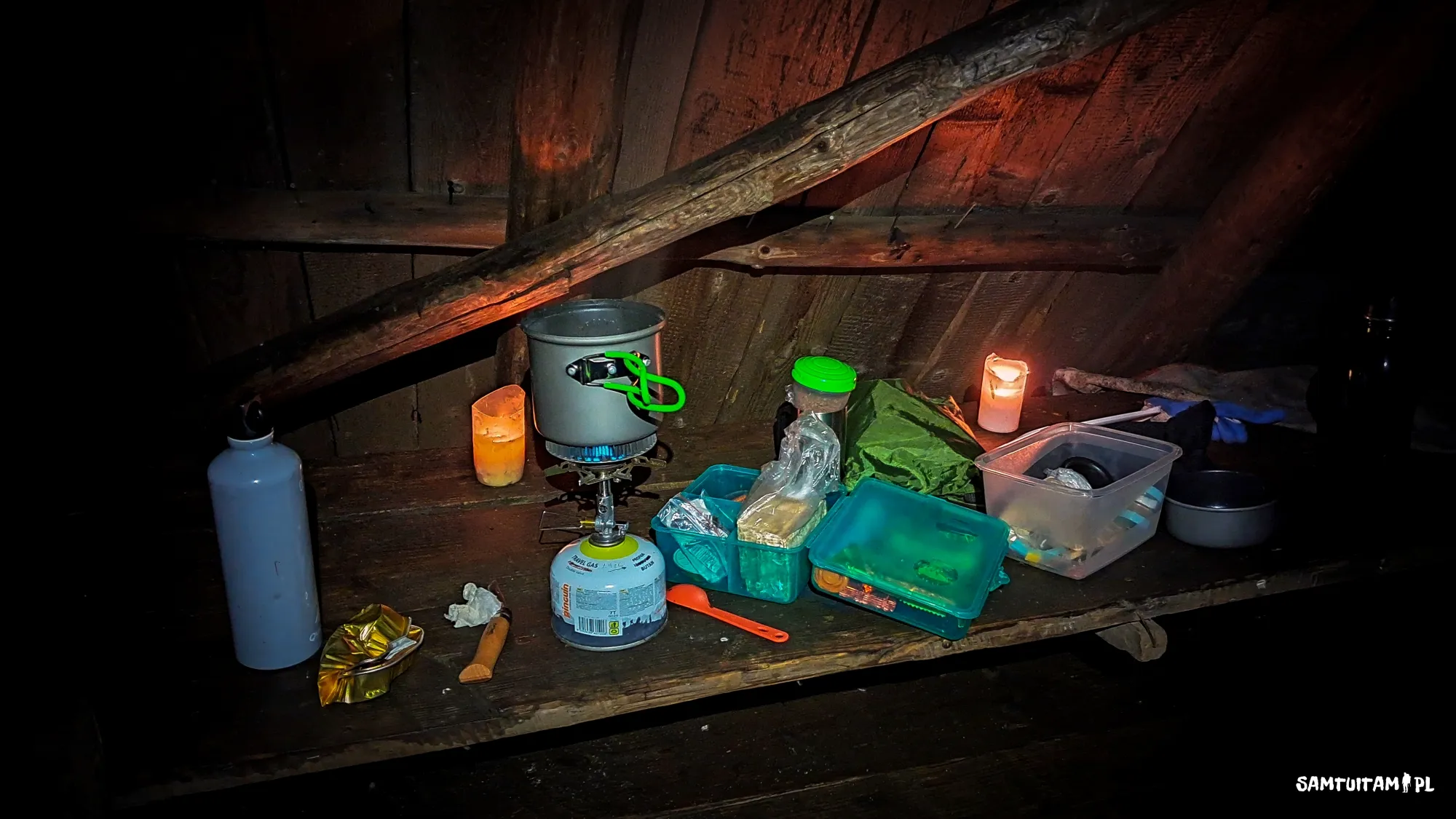 Zdecydowałem się na nocleg w pustej o tej porze roku Studenckiej Bazie Namiotowej Lubań. Ponieważ cały szczyt szczelnie otulały chmury wszystko na górze było mokre, w sumie nie było sensu chować się pod dachem, bo było tam dokładnie tak samo mokro jak gdzie indziej, ale pomyślałem, że będzie to jednak jakaś odmiana po gotowaniu w namiocie zeszłej nocy. W bazie znalazłem kilka niedopalonych wkładów do zniczy, które służyły komuś za świeczki. Odpaliłem te, które nadawały się jeszcze do użytku i urządziłem sobie kolację przy świecach, najcichszą od bardzo dawna. Nie padał deszcz, wiatru nie było, tylko chmura otulająca wszystko i kropelki wody srebrzące się w świetle lampki. Siedziałem, przenikała mnie wilgoć i zaczynałem marznąć, a mimo to czułem pełnię szczęśliwości. Chciałem zadzwonić do żony by podzielić się tą radością, ale zasięg okazał się zbyt słaby. Ledwo udało się wysłać SMS.